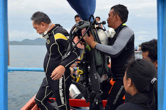 Menteri Kehutanan Zulkifli Hasan (kiri) sedang bersiap melakukan penyelaman (Diving) di perairan sekitar Pulau Pahawang, Pesawaran, Lampung, Kamis (26/12). Selain mengunjungi dan memberikan bantuan kepada warga, Menhut juga menyempatkan memantau kondisi hutan dan ekosistem laut di sekitar kepulauan tersebut. ANTARA FOTO/Kristian Ali/ss/pd/13