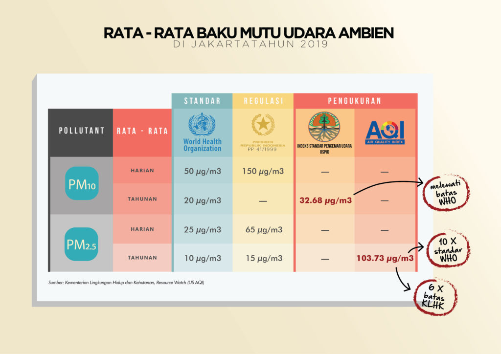 Berdasarkan data SPKU DLH Jakarta hanya dua hari (1%) kualitas udara baik, 172 hari (48%) kualitas udara sedang, 183 hari (50%) dengan udara tidak sehat dan delapan hari (2%) dengan udara sangat tak sehat.