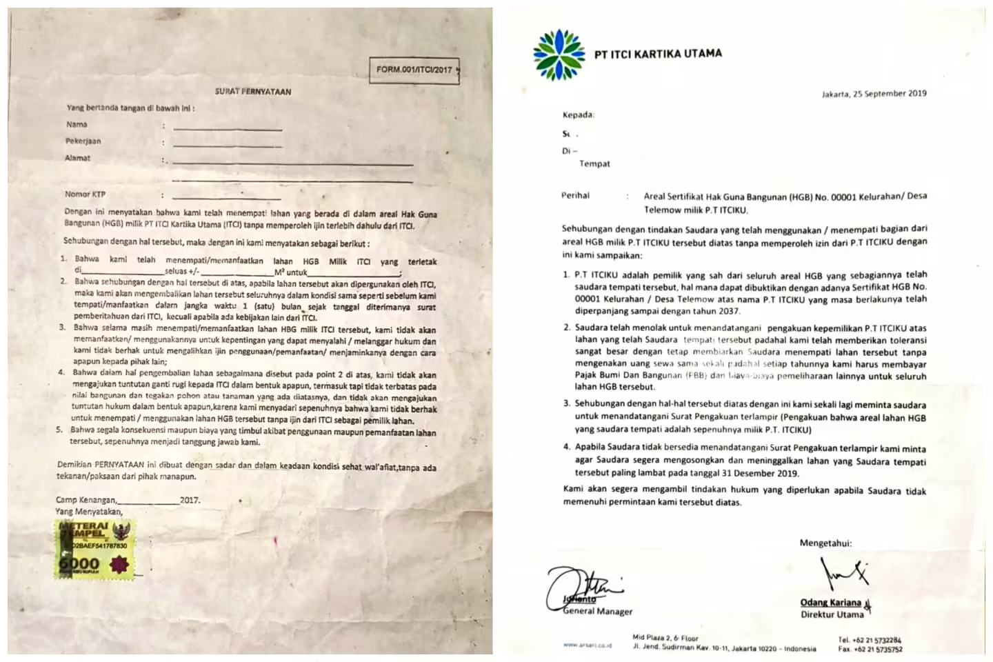 Setahun kemudian, PT ITCI KU kembali mendesak warga untuk angkat kaki. Kali ini mereka mengingatkan agar warga segera menandatangani surat pernyataan yang dikeluarkan 2017 lalu. Surat peringatan itu dikeluarkan pada 25 September 2019, ditandatangani Direktur Utama, Odang Kariana dan General Manager, Julianto. Mereka (PT ITCI KU,red) juga mengancam akan membawa ke ranah hukum.