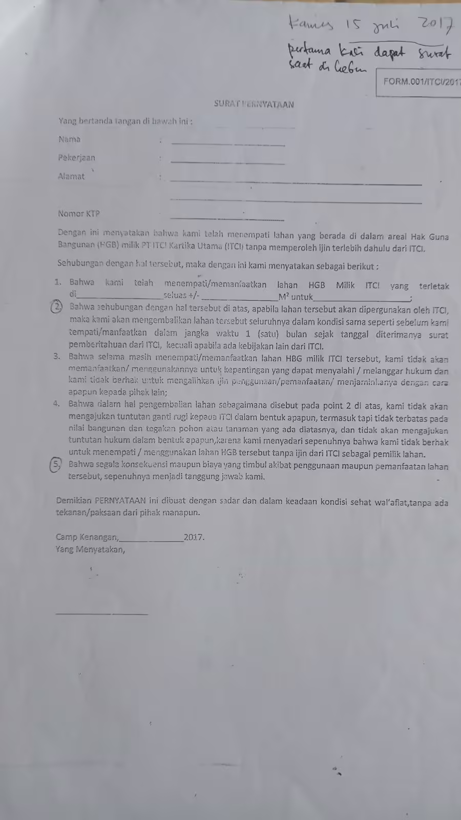 Ada empat poin utama dalam surat yang dikeluarkan pada 15 Juli 2017 tersebut. Pertama, warga harus menjelaskan luasan lahan yang ditempati beserta pemanfaatannya. Kedua, pihak PT ITCI KU menjelaskan bahwa lahan itu akan digunakannya dan warga wajib mengembalikan lahan itu seperti kondisi semula saat baru mereka tempati. Warga diberikan waktu satu bulan untuk mengembalikan kondisinya seperti semula sejak menerima surat tersebut.