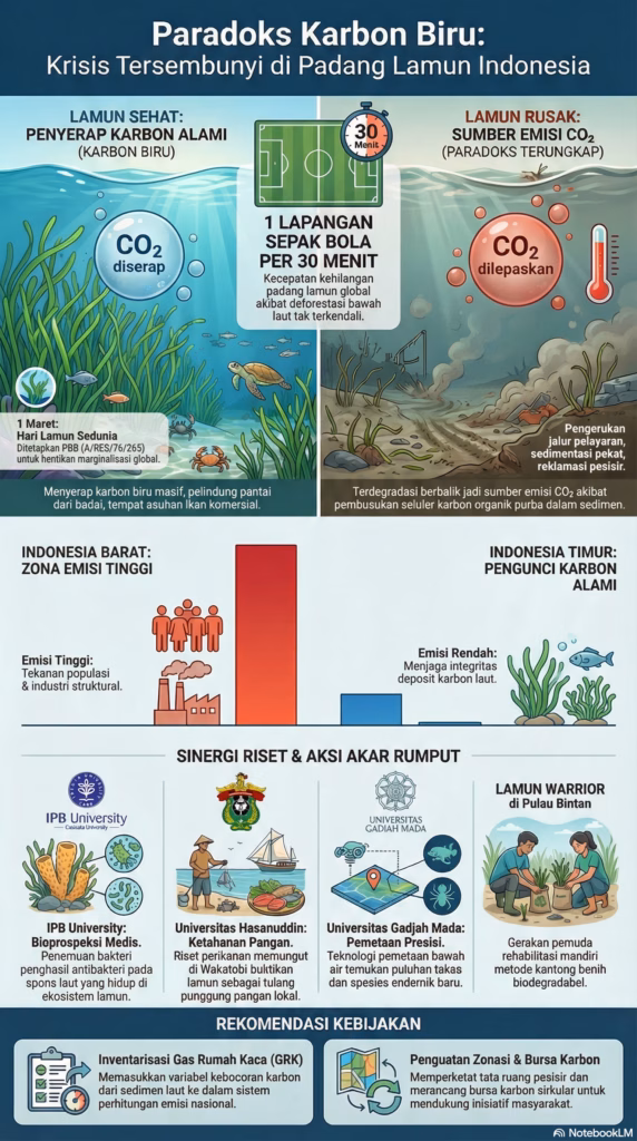 Ketika integritas padang lamun dihancurkan oleh pengerukan jalur pelayaran, tertimbun limpasan sedimentasi pekat, atau tergilas proyek reklamasi, jaringan biomasanya akan mati secara massal. Pembusukan seluler oleh mikroorganisme kemudian membongkar rantai karbon organik purba dalam sedimen laut dan melepaskannya kembali sebagai gas karbon dioksida.