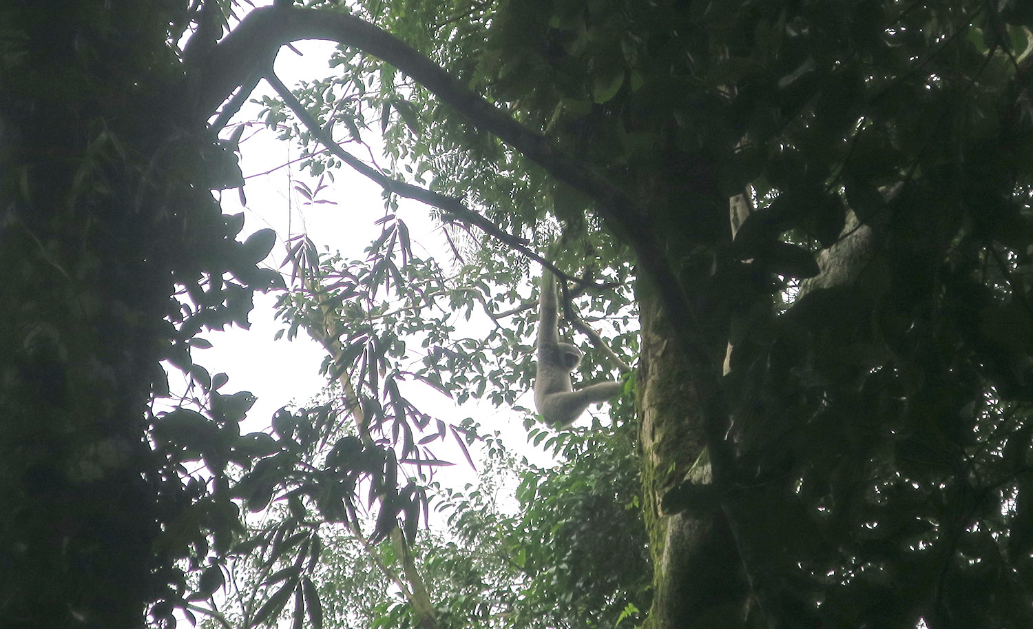 Finally, at around 3:00 pm and without a sound, a Javan gibbon appears on one of the branches. While one team member continues to observe the gibbon as it moves, another concentrates on pointing a camera. After hanging around for a moment on one of the branches, the gibbon swings from one branch to another until it eventually disappears from view.