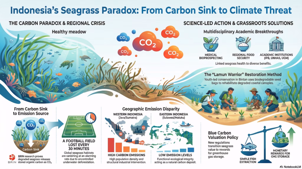 Monumental findings from Indonesia’s National Research and Innovation Agency (BRIN) completely overturn this flawed conventional assumption. Extensive research led by Principal Researcher A’an Johan Wahyudi proves that severely degraded seagrass ecosystems do not simply die; they invert their function to become active sources of carbon emissions into the atmosphere.